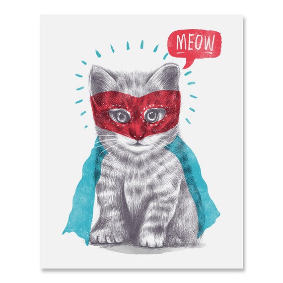 Super Hero Cat Art Print Cute Kitten Poster Cat Lover Etsy