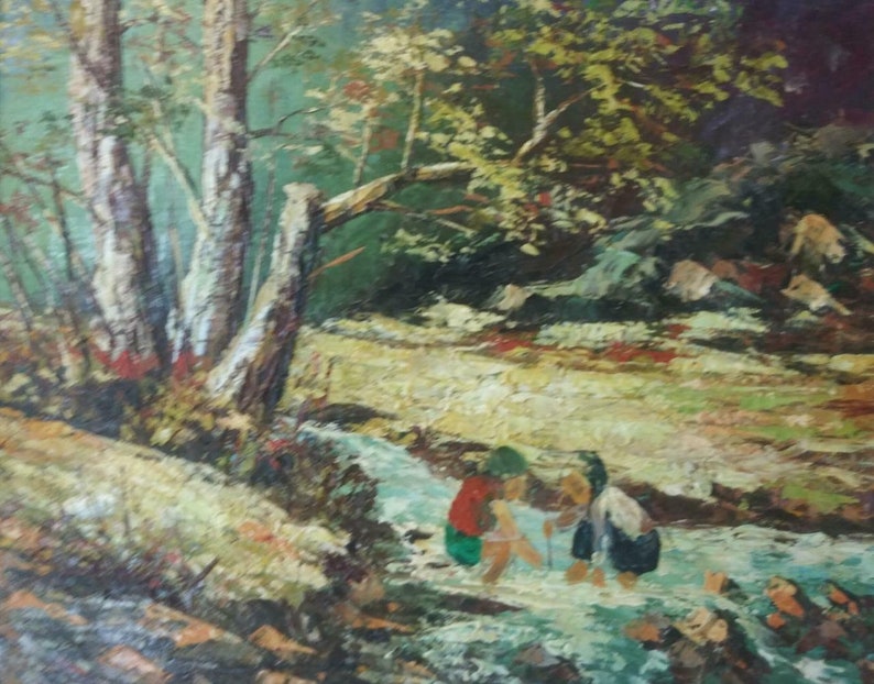 Vintage Oil Painting Landscape Kids Trees Expressionist Mid Etsy