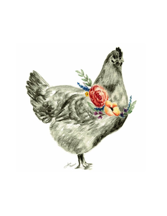Hen With Flowers 8x10 Print Chicken Drawing Farm House Etsy