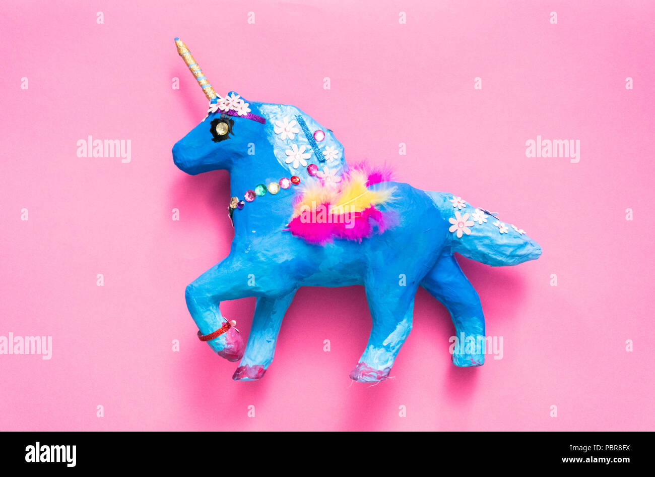 Kids Craft Painted Blue And Decorated With Jewels And Feathers